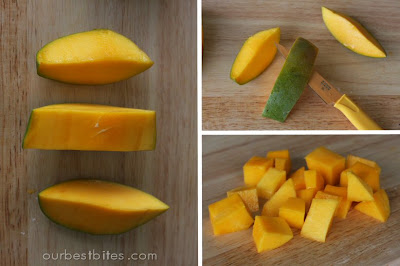 Mangoes have a big seed in the middle, so you have to cut around it. They’re also super slippery when peeled, so you’ll find it easiest to cut first, peel second.