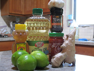 Rinse shrimp in cold water and place in a large Ziploc bag. Combine garlic, ginger, both chili pastes, honey, lime juice, salt, pepper, and oil in a large bowl. Whisk thoroughly. Set aside 1 c. of the marinade. Pour remaining mixture over shrimp and refrigerate for at least 24 hours and up to 48 hours.