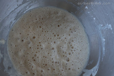 In the bowl of a stand mixer, sprinkle the yeast over the water, allow to bloom for a few minutes, then whisk until smooth. Whisk in 1/2 C of the flour. Cover with plastic wrap and let stand in a warm spot for about 30 minutes.