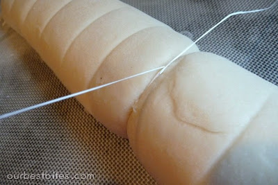 First score the rolls so you know you’re going to cut evenly. Then slide the thread underneath the rolls, cross over the top and pull. You’ll get razor sharp cuts without smashing your pretty dough.