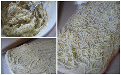 Anyway, roll your rough into a rectangle that’s about 18-20 inches by 6 inches. Smear garlic butter over the entire surface of the dough and then sprinkle with cheese.