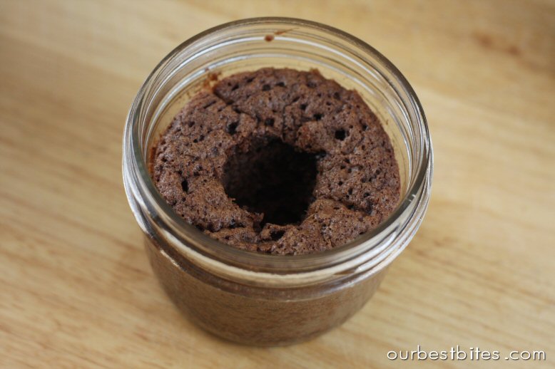 Place the mason jars on a cookie sheet. Divide the mixture evenly among the 8 jars (no need for greasing the jars) or 12 cupcake liners if you’re going that route. The jars should be about half full or a little less. Bake until a toothpick inserted into the center of the jar comes out with only a few moist crumbs attached 22-25 minutes. Remove from oven and carefully (with a pot-holder!) transfer jars to a cooling rack. Let jars cool till at least close to room temperature before topping with ganache.