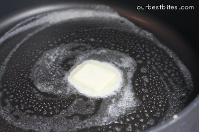 - Heat a large saute pan over medium high heat. You'll want a pan large enough that your onions can spread out and have contact with the bottom of the pan. I like to use a combo of butter and olive oil. I use about 1/2 - 1 tablespoon (of butter and olive oil combined) per onion. Add the butter and oil to the pan and let the butter melt. It should melt and sizzle a bit, but you don't want your butter to brown so if that happens, your pan is too hot.