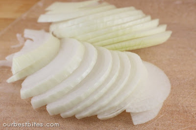- Start by slicing your onions. They can be thicker or thinner, it's just important that they're a uniform size so they cook evenly.