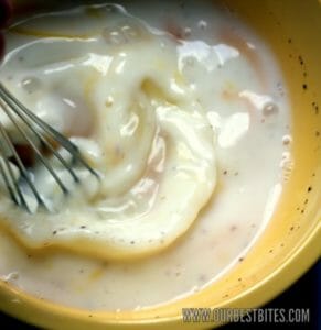 Home » Recipes » Course » Breakfast » Easy Potato and Bacon Breakfast Casserole » Whisking eggs and milk