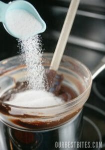 Home » Recipes » Course » Desserts » Cakes & Cupcakes » Old-Fashioned Chocolate Layer Cake » Adding sugar to melted chocolate