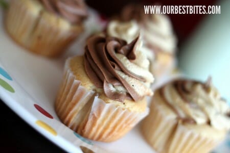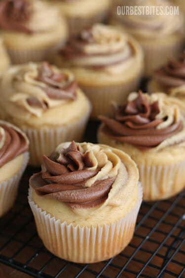 While the cupcakes are cooling, you’ll want to get the frostings ready. Yep, that would be “frostings.” Plural. It’s hot and Friday and the end of summer and your kids are fighting–I promise, you need frostings. For these cupcakes, I used the peanut butter frosting from these cookies and then the chocolate frosting from the infamous Tim Riggins Brownies.