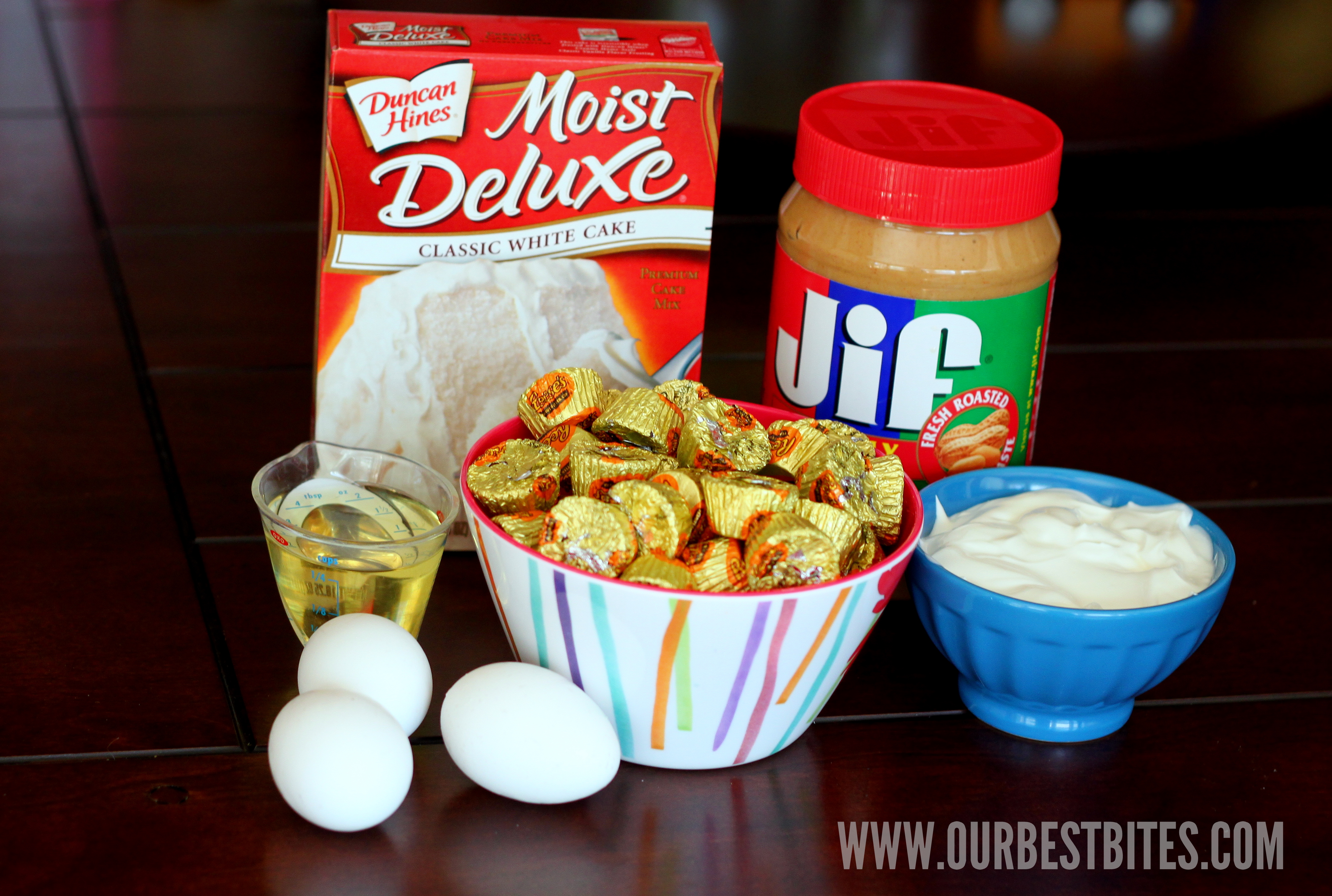 I really am not much of a semi-homemade kind of girl–I really do make almost everything from scratch. But when it comes to cupcakes, doctored-up cake mix cupcakes really are my favorite way to go. They’re quick, easy, delicious, and fail-proof, regardless of elevation, humidity, or political affiliation. My only snobbery when it comes to doctoring up cake mixes is that I will only use Duncan Hines cake mixes (and they don’t even pay me to say that…in fact, I’m pretty sure I’ve never had a conversation with anyone affiliated with Duncan Hines). You’ll need a white or yellow Duncan Hines cake mix as well as canola oil, 3 eggs, sour cream, vanilla, small Reese’s Peanut Butter Cups, and peanut butter.