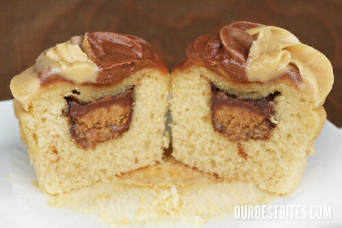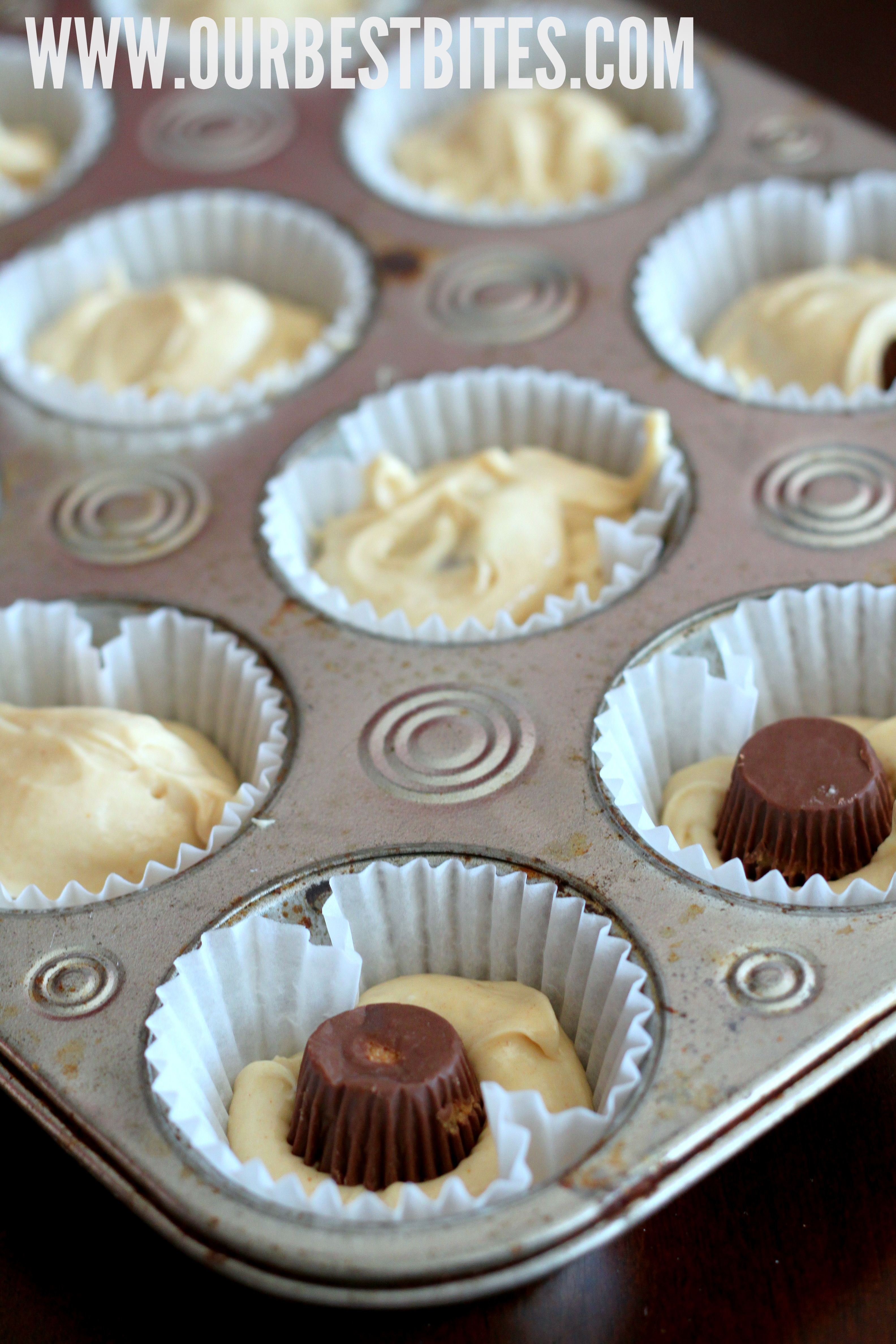 - Fill each muffin cup about 1/2 full with batter. Top with an unwrapped Reese’s Peanut Butter Cup , then fill the muffin cups with the remaining batter. Make sure the Peanut Butter Cups are covered and the cups are about 3/4 full. Bake for 18-22 minutes or until the tops are golden. Remove from the oven and allow to cool completely.