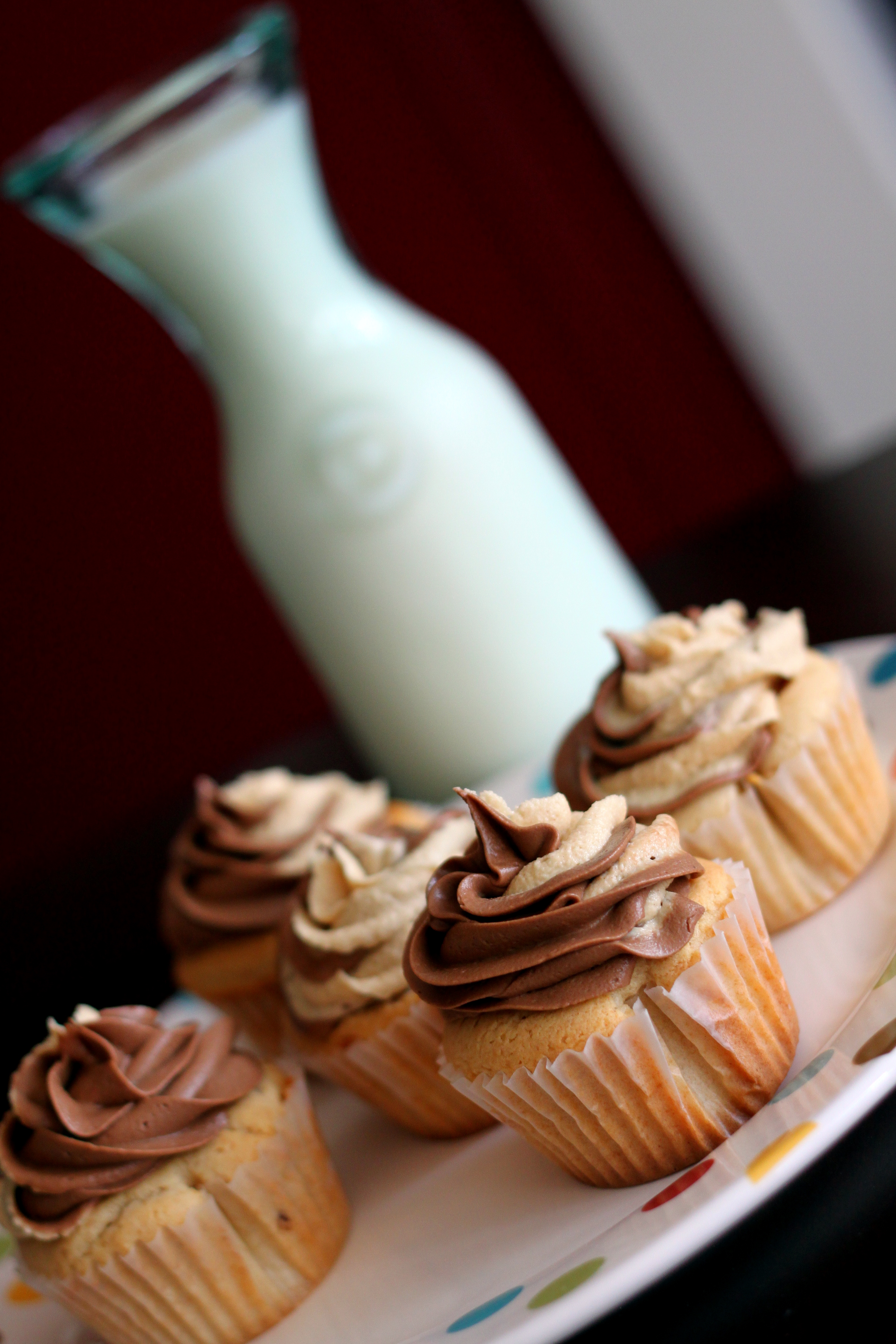 - While the cupcakes are cooling, prepare the frostings. For both frostings, just combine all the ingredients for each one and whip until light and fluffy, adding additional milk as needed. Frost the cupcakes with the swirled frosting in tutorial linked to below.