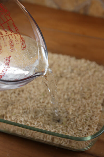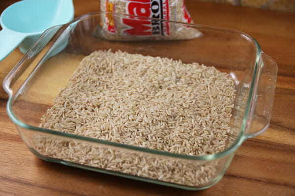 Place your dry brown rice in an 8×8 pan.