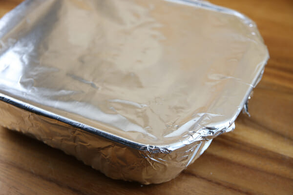 Cover the pan tightly with foil. You don’t want any of that moisture escaping and evaporating during cooking, so wrap it down tight.