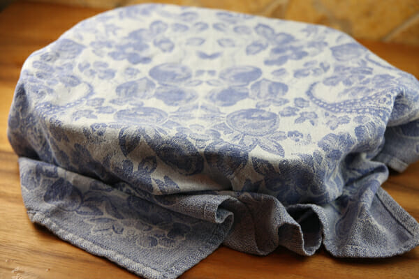 Immediately cover the pan with a clean kitchen towel. Notice how I pulled the towel tight over the top and tucked the edges underneath the pan. That’s so the towel doesn’t actually sit on the rice and just stick to it.