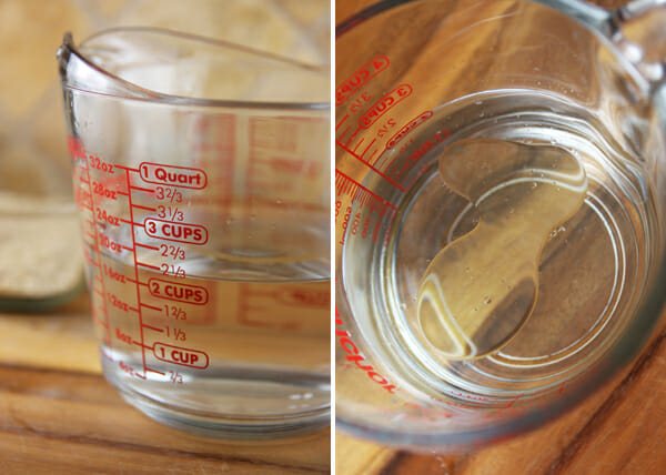 Combine 2 1/3 cups water with just a couple teaspoons of oil. Bring it to a boil, and then add a little salt. You can also use broth for a little extra flavor.