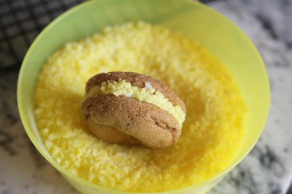 - When cookies are completely cool, spread a generous dollop of frosting on one cookie and top with another. Dip cookies in crushed lemon candy and between layers of wax paper in airtight container in refrigerator up to 5 days.