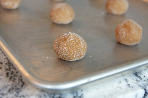 - The original recipe calls for chilling the dough, but I skipped that step and they baked up perfectly. Just roll into balls and roll them in sugar. I use my standard sized cookie scoop and divide that dough ball in half.