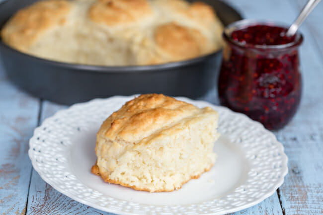 Anyway. These biscuits are not just huge, but they are AMAZING. They’re not flaky, but they’re the softest, lightest, most tender biscuits (which comes from a combination of the lighter flour and the shortening) and they have a rich, butter flavor (which comes from…wait for it…the butter). I suppose you could use them for something like biscuits and gravy, but it almost seems sacrilegious to put anything other than homemade jam on them.