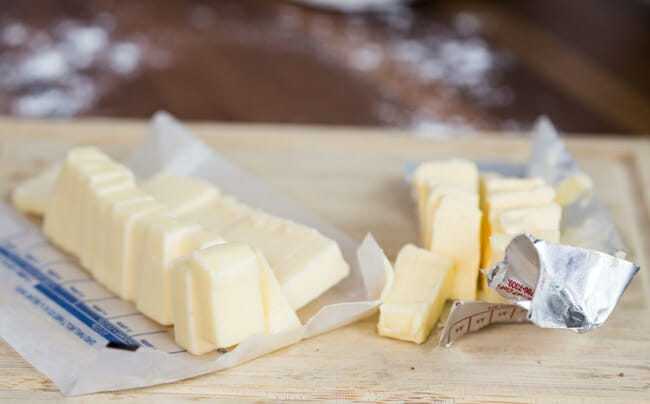 a lot of butter, and a little shortening (again, it is what it is–according to Juli, our friend and resident food specialist–seriously, guys, she develops recipes for Better Homes & Gardens–all Crisco products are now trans-fat free. If that doesn’t do it for you, lard is always an option if your diametrically opposed to using shortening), softened and cut into 1/2″ pieces.
