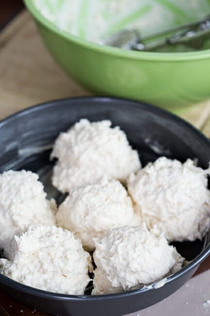 Use a 1/2 cup ice cream scoop or measuring cup to measure out 6 heaping portions of dough and place them each in the prepared pan, one in the middle