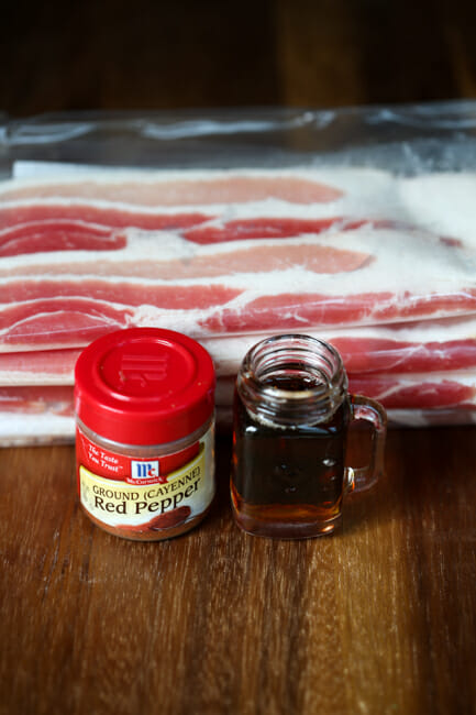 - Whisk together 2 tablespoons syrup and cayenne pepper. Using a pastry brush, brush it over the bacon.