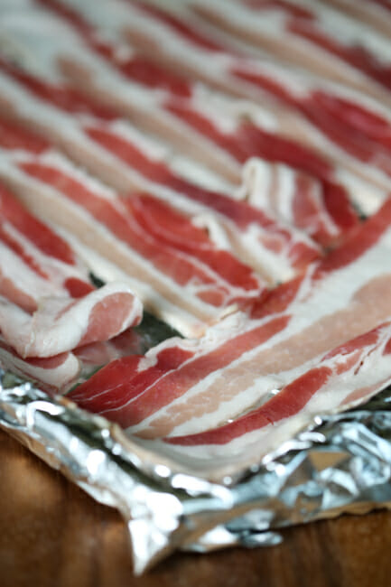 - Preheat oven to 400. Line a rimmed baking sheet with heavy-duty aluminum foil. Place the bacon in a single layer over the foil and set aside.