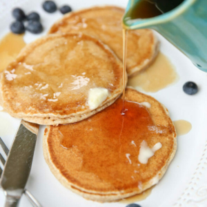 I often add whole wheat flour to baked goods, but as most people know, you very rarely want to add ALL whole-wheat flour.  It is notorious for heavy, dense, and often bitter results, which is why it’s almost always combined with some all-purpose flour.  This recipe is unusual because there’s no white, all-purpose flour here, we’re using 100% whole wheat, and they’re delicious!  Fluffy, soft, and everything a pancake should be.  The most important thing here is that you’re using fresh flour.  If you’re pulling out a bag you’ve had for ages, think again.  Start with a new bag, or one that has been in the freezer for less than 12 months.   If you’re feeling ambitious and want to grind your own flour, that works great as well.  Definitely store your whole wheat flour in the freezer when you’re not using it, it will extend its life!