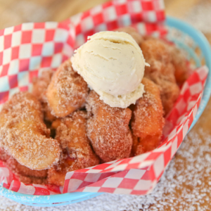 and then dunk them in funnel cake batter and let any excess drip off. Toss them in some oil and they’ll quickly puff up to golden brown perfection. If you’re curious about my little fryer, which I LOVE, I talk all about it in this post.