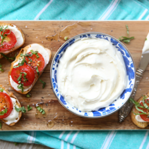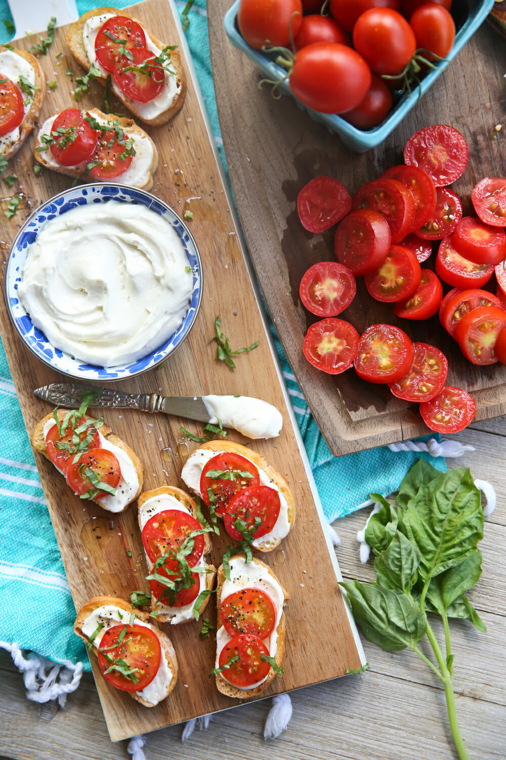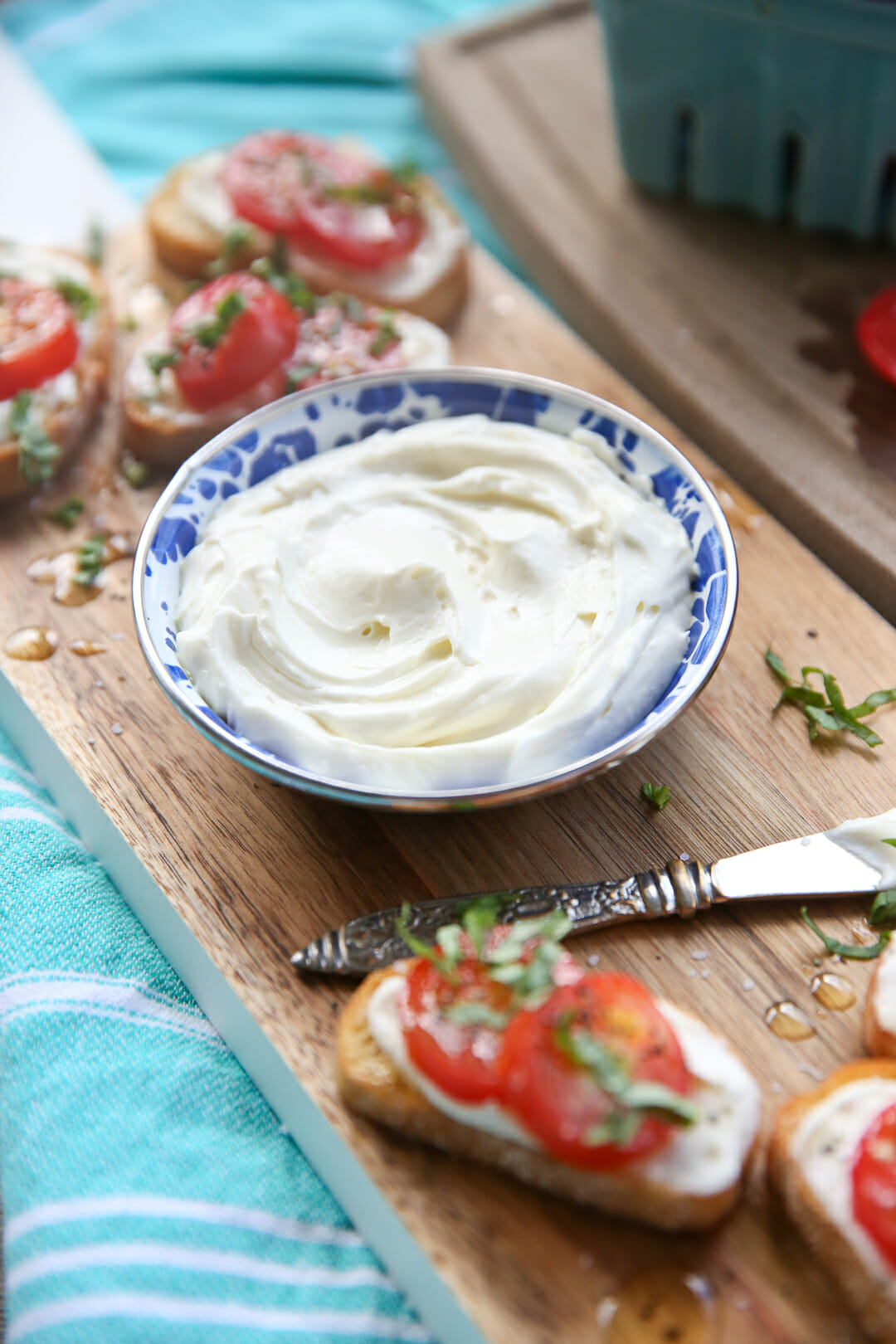 I first saw whipped feta 4 years ago while scrolling through Instagram and seeing this recipe by my friend Kristy. Once it was on my radar I saw it popping up all over, like this recipe by Ina Garten or this one by How Sweet Eats. So what IS whipped feta? It’s basically feta cheese, whipped/pureed with cream cheese so you get this super spreadable, creamy, tangy spread with all the sharp flavor of feta, without the falling-off-crumbles. You can mix it up and add fresh herbs, lemon, more or less olive oil, basically a million and one ways to tweak to your liking. I knew before I ever made it that mine would be spread on toasted crostini with tomatoes from my garden, but later this month I’ll show you how I used it on pizza. You could spread it in a pita or on a sandwich, use it as a dip, or use it on a cheese board. It’s basically amazing.