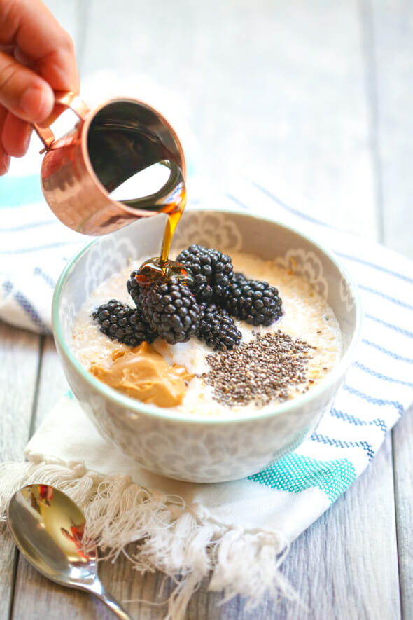 In a microwave-safe bowl, combine 1/2 cup quick cooking oats, 1 cup unsweetened almond coconut milk, and a pinch of salt. Cook for 1 1/2-2 minutes, then carefully remove from microwave. Add 1-2 tablespoons of your favorite peanut Butter, 1 handful blackberries or blueberries (about 1/3 cup), 1-2 teaspoons chia seeds, and real maple syrup to taste.