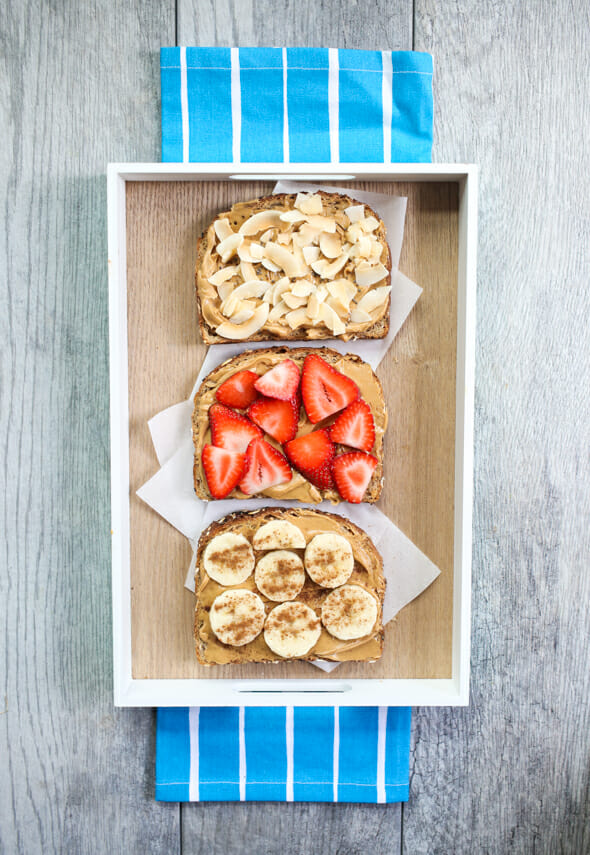 Toast a slice of whole grain bread. Combo 1: Peanut butter, shaved toasted coconut, and chocolate chips (if desired). Combo 2: Peanut butter, sliced strawberries. Combo 3: Peanut butter, sliced bananas, and a sprinkling of cinnamon.