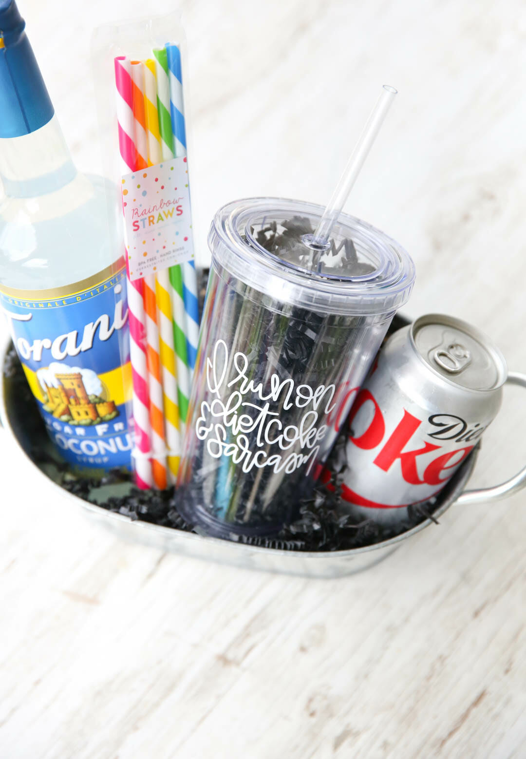 Diet Coke fans- how about a cute gift basket with supplies to make a Dirty Diet Coke?? Inexpensive and so fun! Toss a lime in there, too, or a few packets of True Lime Powder!