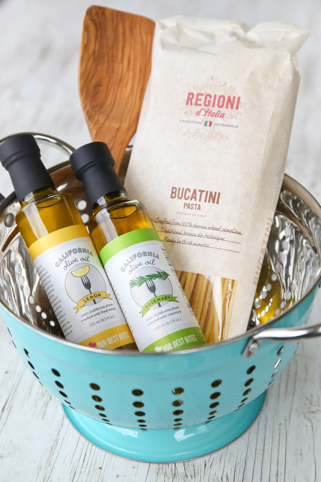 Try a little spin on the traditional gift basket and place your goodies in a colander. I grabbed a inexpensive, but fancy looking bag of Italian pasta and an olive wood spoon, and paired it with our Lemon and Rosemary Extra Virgin Oils (two of my most favorites). This is basically dinner in a bowl!