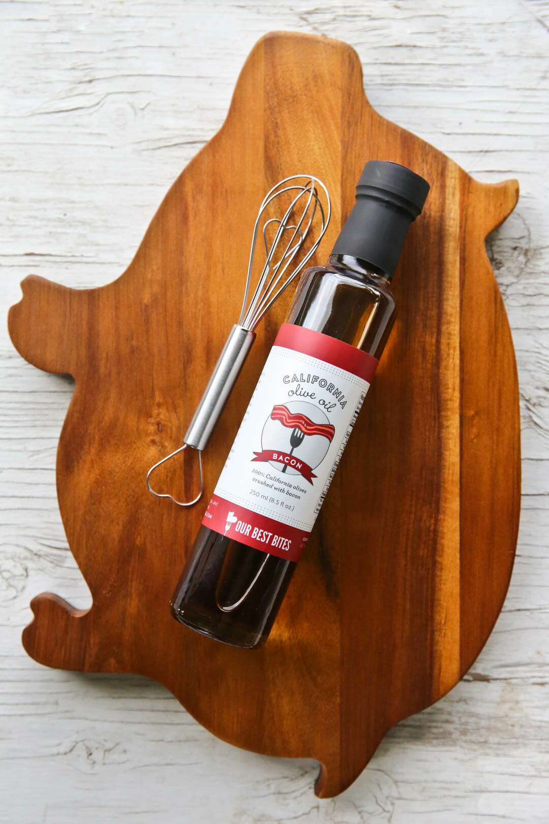 Cutting boards are always a great pairing for a culinary gift. Grab a nice one and you don’t need a whole lot more. This piggy was just begging to be paired with our Smoked Bacon Olive Oil! I added a little Mini Heart Whisk for the perfect finishing touch.