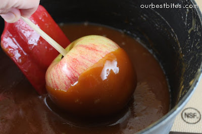 • Remove apples from fridge and dry them thoroughly with a towel. Dip in caramel, rolling and twirling each one so it gets well coated. Let excess drip off and then place on prepared sheet. Refrigerate for 10-20 minutes to set the caramel and then enjoy!