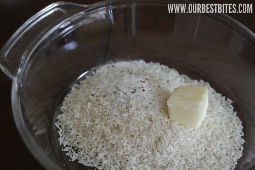 Preheat your oven to 350. Place 1 cup rice in an oven-safe dish with 2 tablespoons butter, 1 teaspoon kosher salt, and a few cracks of freshly ground black pepper.