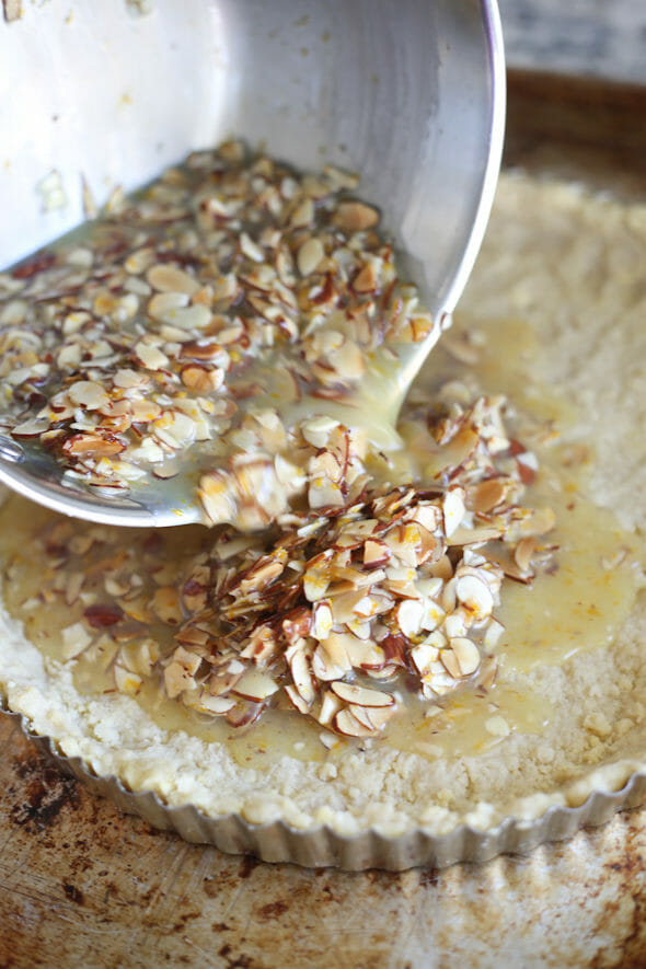- Pour mixture into pastry crust, spread out almonds if necessary into an even layer.