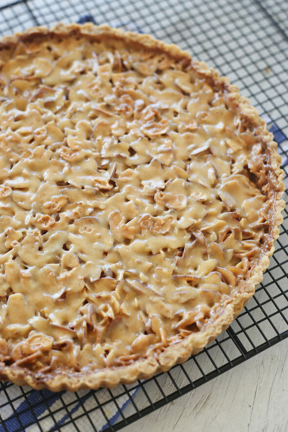 You’ll notice that although it’s called an “Almond Toffee Tart” there’s no actual toffee in the recipe. That’s because it’s a magical tart. You toss together a simple filling and while it’s in the oven the little tart fairies come and turn that filling into a chewy, caramelized, toffee-like substance. Amazing!