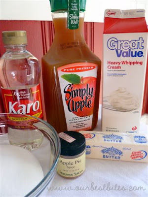 This caramel recipe starts out like all the others: Sugar, whipping cream, butter, and corn syrup (which is NOT high fructose corn syrup before anyone accuses me of child abuse/mass murder/crimes against humanity). But then we add in apple cider (not alcoholic cider, for our friends not in the U.S.; just the high-quality, fresh-tasting, pressed apple juice) and awesome baking spices:
