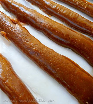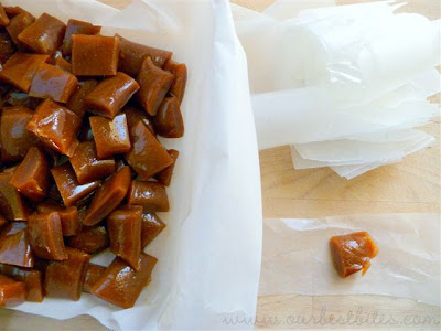 Just a thought on the wrapping of the caramels. I make huge batches of caramels every year and my husband has helped hone the wrapping process. You definitely want to use wax paper, we've tried cellophane and it doesn't stay at all. We use a small saw to cut one roll of wax paper in half, so you have two small rolls. Then I wrap the wax paper around a can, making a circle. Then if you press the circle down and cut both sides, you end up with lots of nice squares without taking nearly as much time as cutting them individually. As for cutting the caramels, line the pan that you are going to use to put the caramels in to cool with parchment paper and spray with nonstick spray. Then, when the caramels are ready to wrap, you can easily flip the pan over onto a cutting board. We've found that using a large pizza cutter is much easier than cutting individually (and much faster!). Then wrap (no short-cut for that!) This process saves us tons of time from how we used to do it. You can trip the edges of your wax paper if its too big. I can't wait to try the apple version of the caramels!