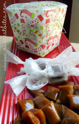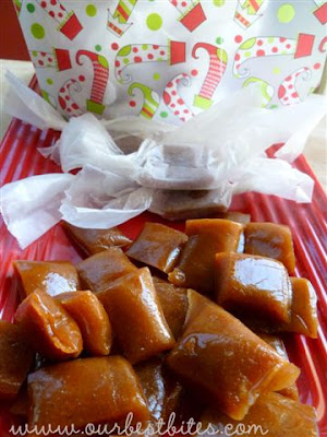 Speaking of goodies…how about a little Christmas candy to get you in the holiday mood? I’ve made caramels at Christmas (and only at Christmas because I love to wrap them about as much as I love a good root canal which, by the way, you might experience if you eat too many of these babies!) for a good 8 years now and I have my tried-and-true recipe, which I would share except for the fact that it is one of the new recipes included in our cookbook. Well, I got a stack of recipe cards from America’s Dairy Farmers and while I normally leaf through these kinds of recipes and either toss them or place them in a stack of stuff to try at some undetermined time, there were, like, three in this particular collection that I had to try ASAP. Like this one.