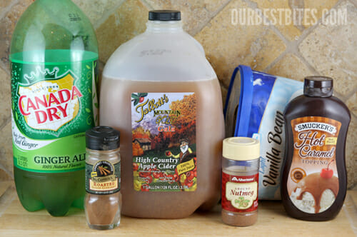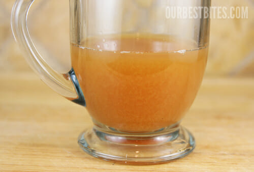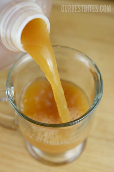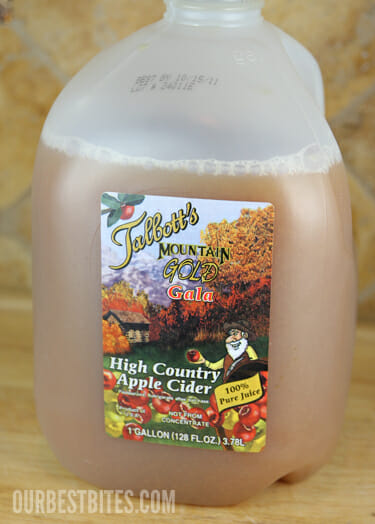 Make sure you use a good apple cider, not plain ol’ apple juice. Sometimes you’ll see jugs labeled “apple cider” next to the apple juice, but don’t buy it if it looks clear and light, like normal apple juice. You want an unfiltered cider, so it has little bits of pulp in it; it should be a darker, amber color like this picture. Don’t be afraid to buy the big jug. You can make lots of things with the left overs like, Hot Caramel Apple Cider, Apple Butter Pork Chops, and Tortellini Sausage Soup.
