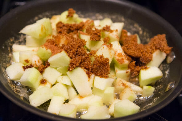 • Add the apples, 2 tablespoons of brown sugar, and ½ teaspoon pumpkin pie spice and sauté until the apples start to soften and the brown sugar/butter mixture becomes thick and syrupy, about 3-5 minutes. Remove from heat and set aside.