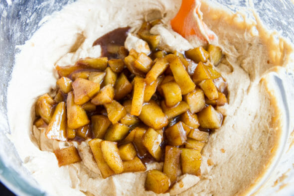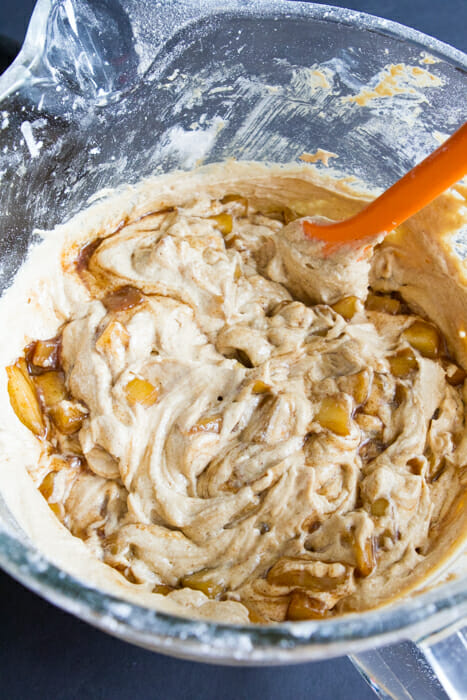 5. Gently fold in the cooked apples, spread the batter in the pan, and bake for 35–50 minutes until a toothpick comes out clean.