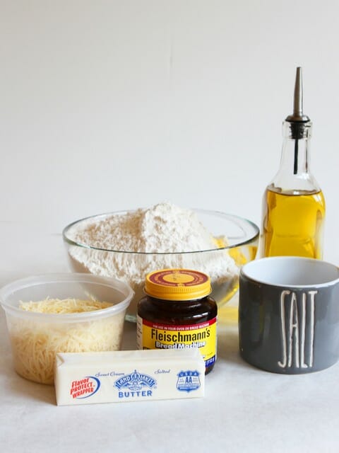 You’re going to need active dry yeast (I use bread machine yeast), warm water (my rule of thumb is a temperature that would be comfortable for a hot shower but not so hot that you would be uncomfortable washing your hair or face in), sugar, all-purpose white flour, salted butter, kosher salt, extra-virgin olive oil, and shredded Asiago cheese (or you could use one of those 3-cheese Italian blends that has Asiago, Romano, & Parmesan).