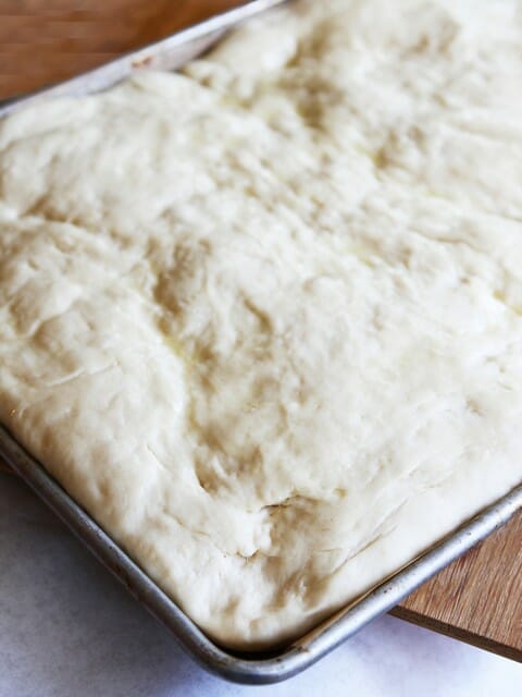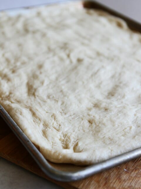 When done kneading, cover with a clean towel and allow to rise for 1 hour. After one hour, lightly spray an 18×12″ pan with non-stick cooking spray. Punch down the dough and press it into the pan (you can use a rolling pin to help make things smooth; start pressing in the middle and work your way out to the edges). Cover and allow to rise for 45 minutes.