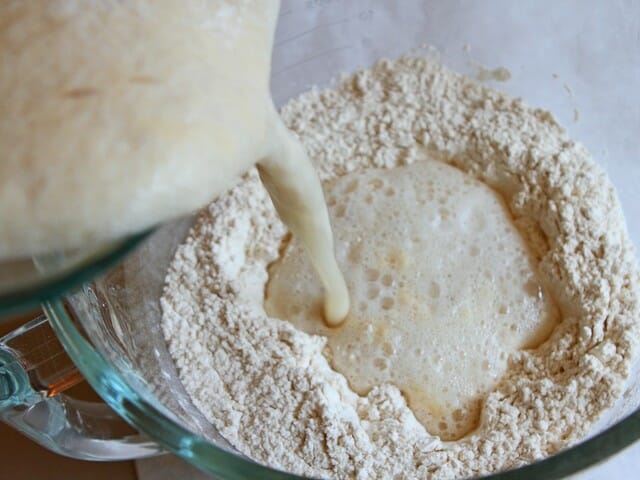 Place 4 cups of the flour in the bowl of a stand mixer and whisk in the 2 teaspoons of salt. Mix in the melted butter. Add the yeast mixture