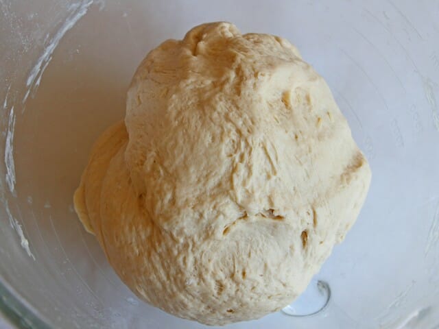 and mix until a sticky dough forms. Add the remaining flour, 1/2 cup at a time, until a smooth dough forms that pulls away from the sides of the bowl and forms a ball in the center. Knead on low speed for 5 minutes.