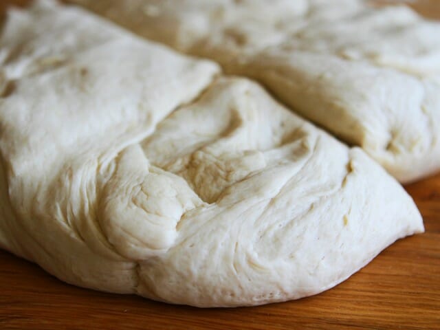 After one hour, lightly spray an 18×12″ pan with non-stick cooking spray. Punch down the dough