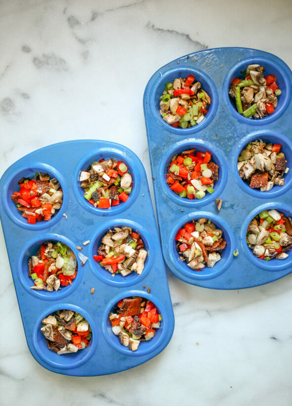- Toss together some chopped mushrooms, bell pepper, green onions, and bacon. Distribute that mix evenly among the greased muffin tins.