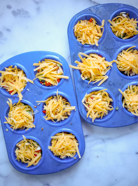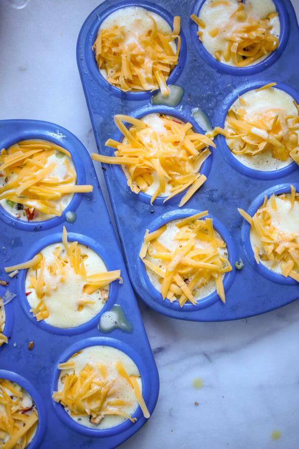 - Pour the egg mixture over everything until it reaches nearly the top of the muffin tin.